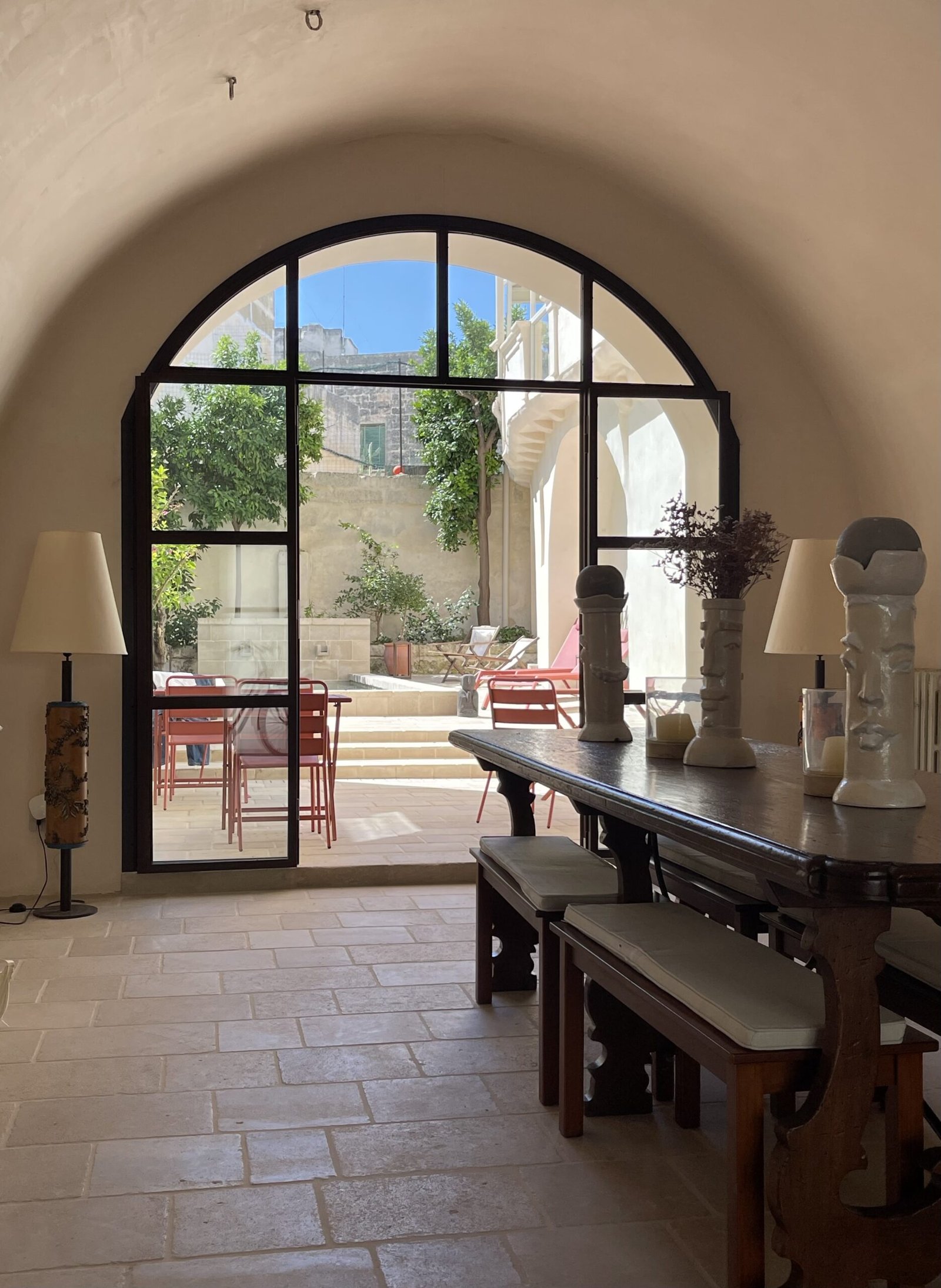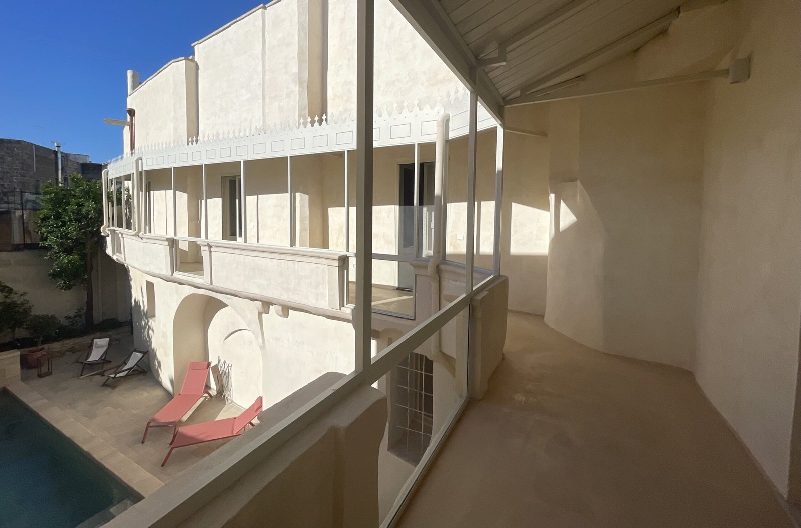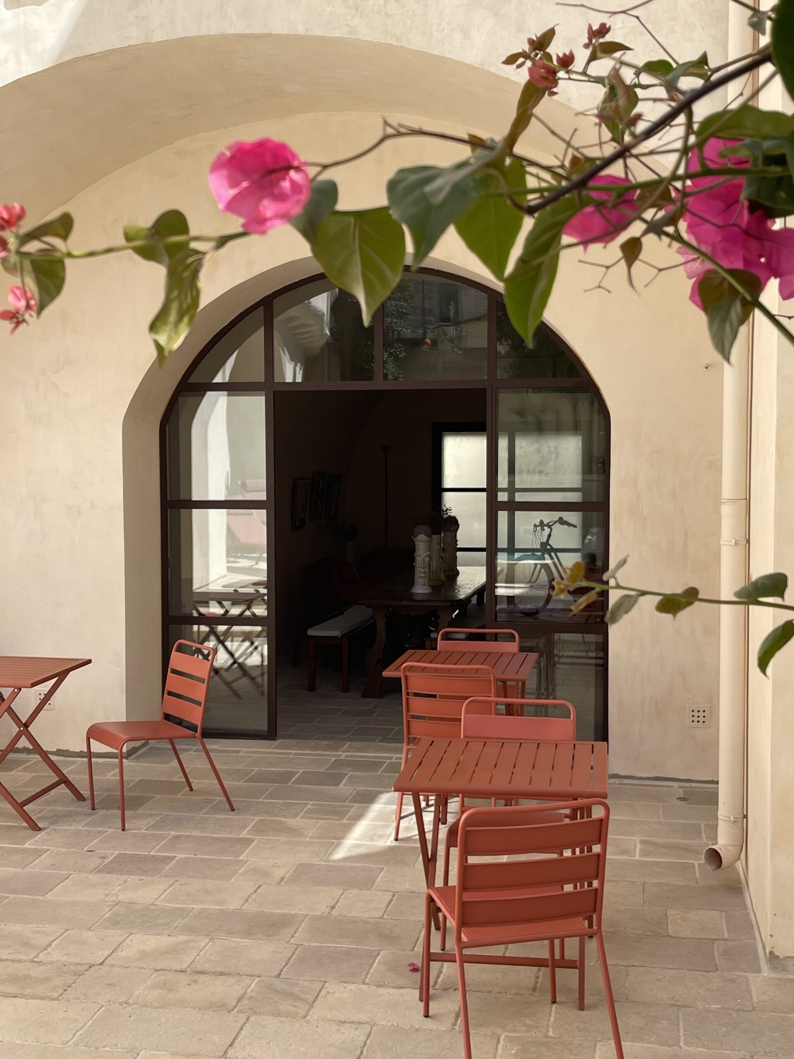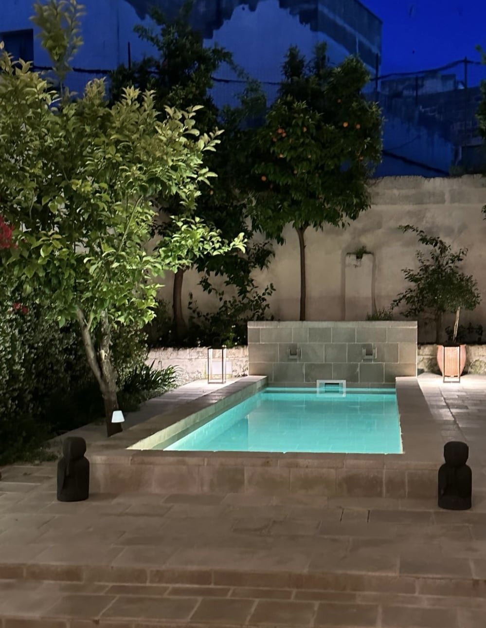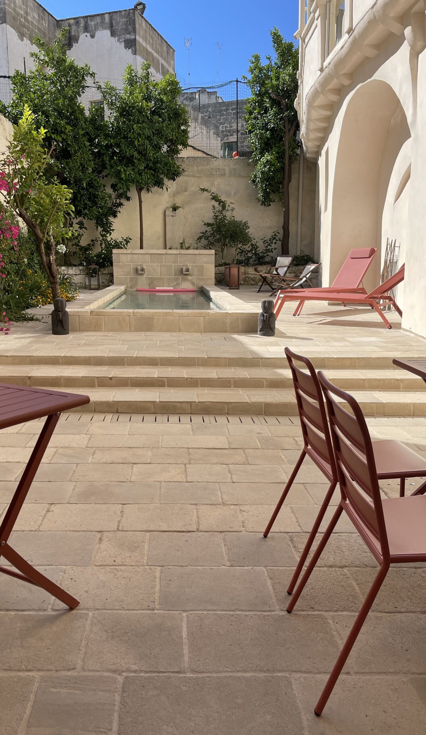 Beneath its white stone arches and behind its pink façade, discover a garden of orange trees—a haven of freshness—and a secluded pool hidden from view, just steps away from the main piazza and lively streets.